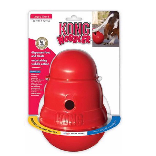 [오리지널 강아지 장난감] 오뚝이 KONG 워블러 는 반려견에게 사료를 더욱 효과적으로 급여하기 위하여, 만들어진 기능성 장난감으로 제작된 상품으로, 반려견이 코나 손으로 워블러를 치게되면 구르고 회전하며, 간식과 사료를 떨어뜨리는 장난감입니다. 이는 빠르게 밥을 먹는 아이들이나 출근 때문에 아침에 허겁지겁 나가느라 반려견의 밥을 제대로 챙겨주지 못하는 보호자들에게 효과적으로 사용될 수 있습니다.